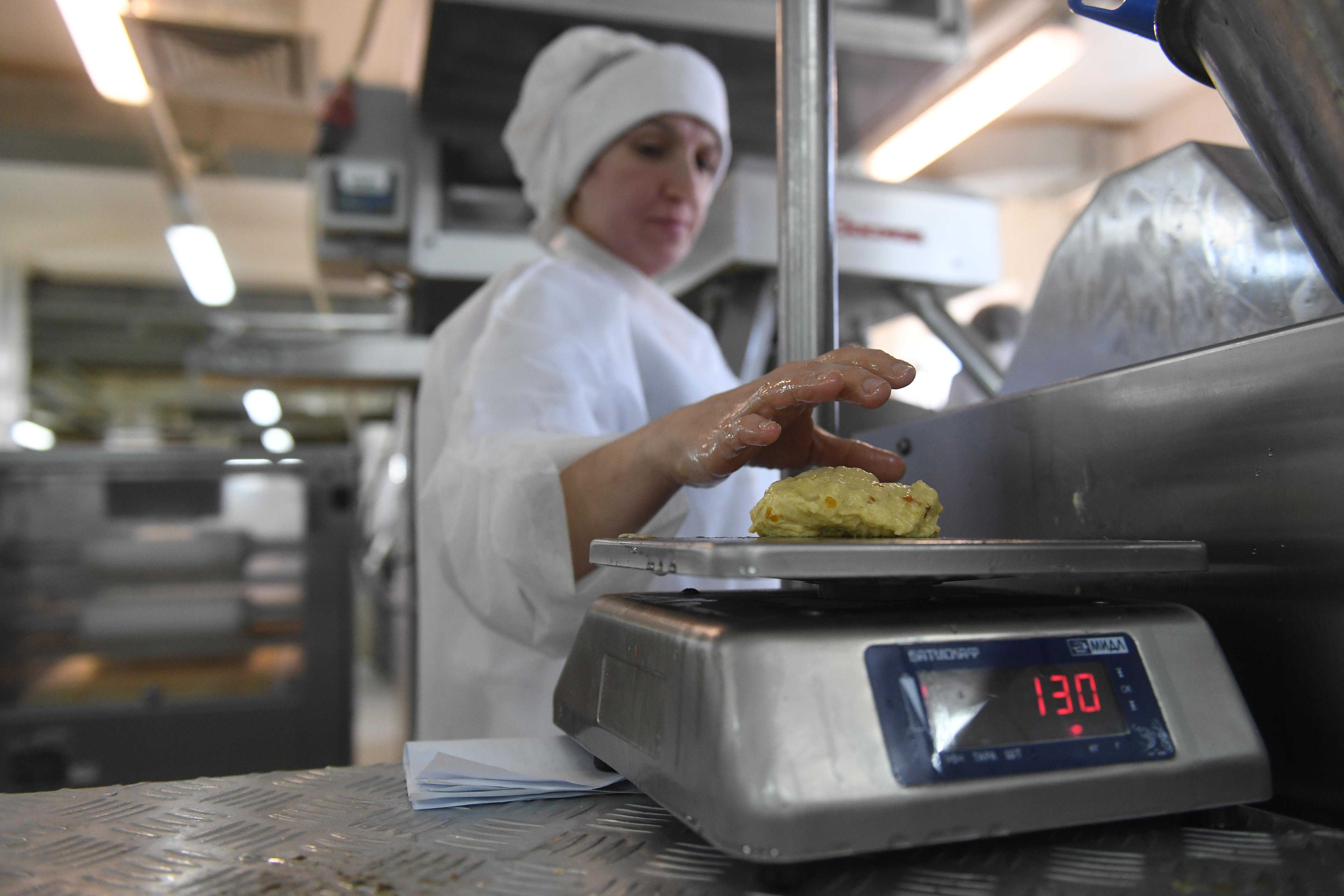 4月18日,在俄罗斯莫斯科的一家面包厂,工作人员称量面团。新华社/卫星社