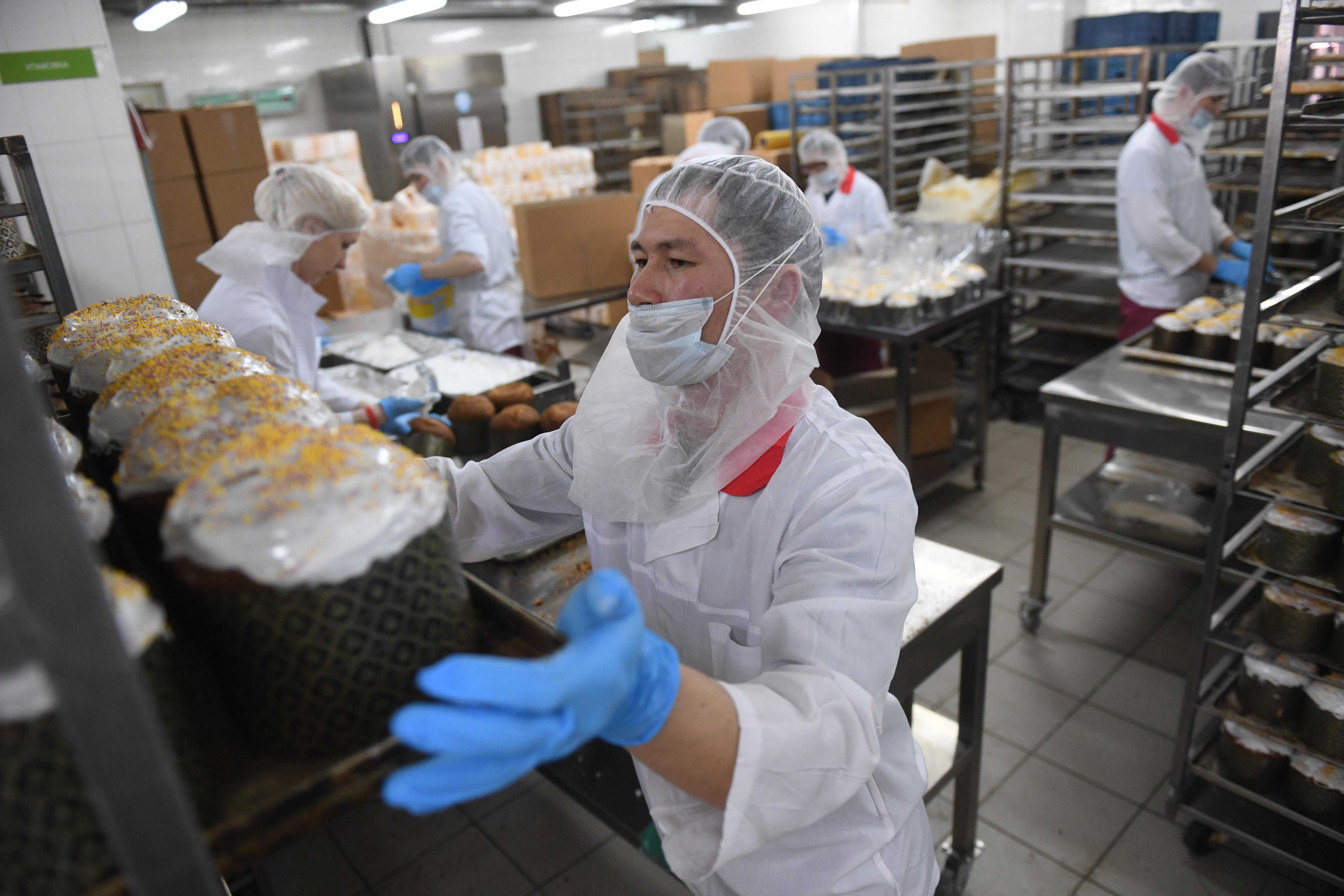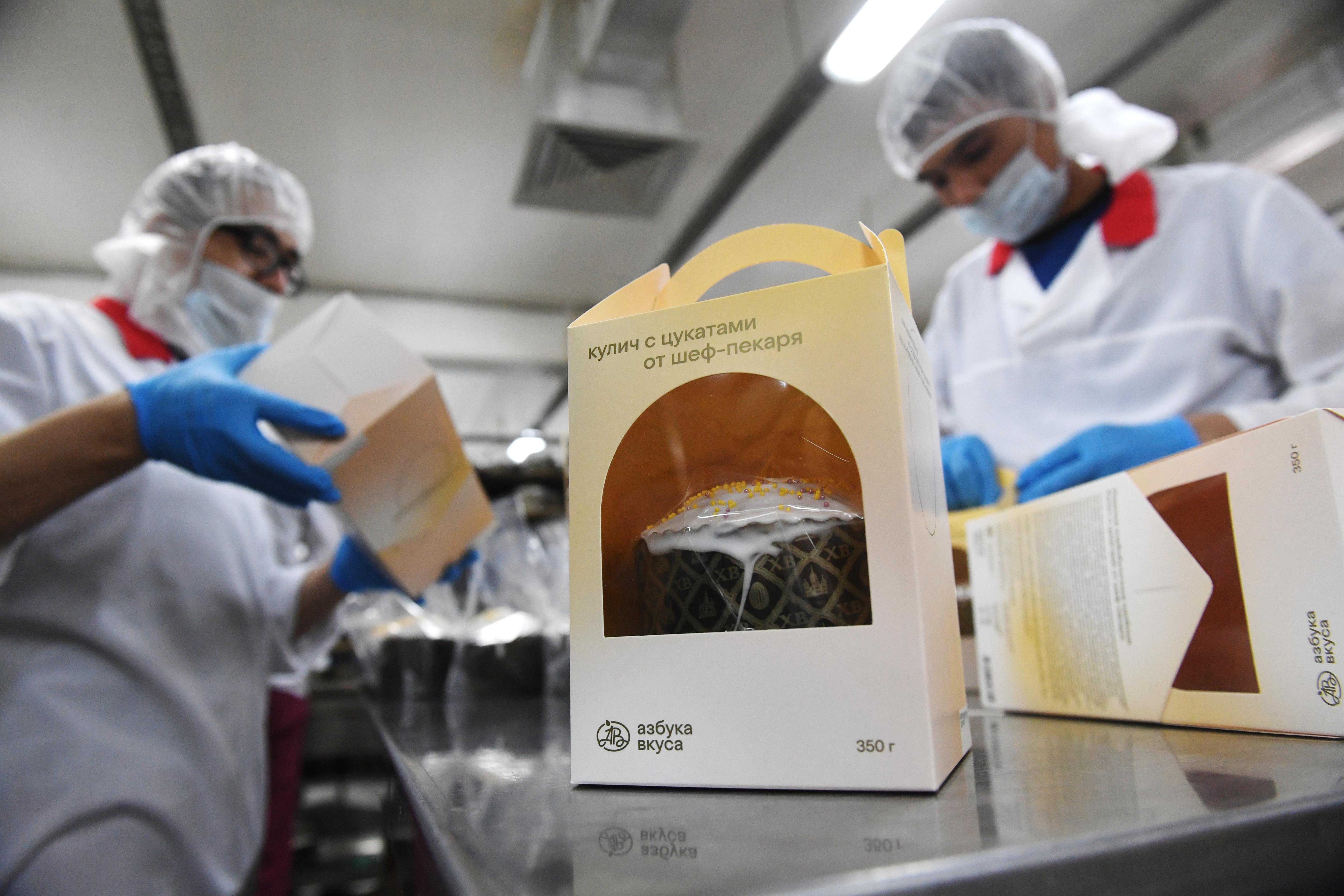 4月18日,在俄罗斯莫斯科的一家面包厂,工作人员包装复活节蛋糕。新华社/卫星社