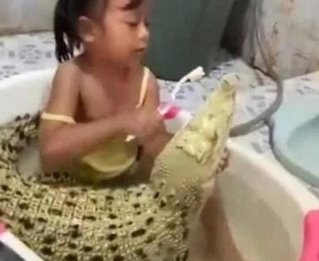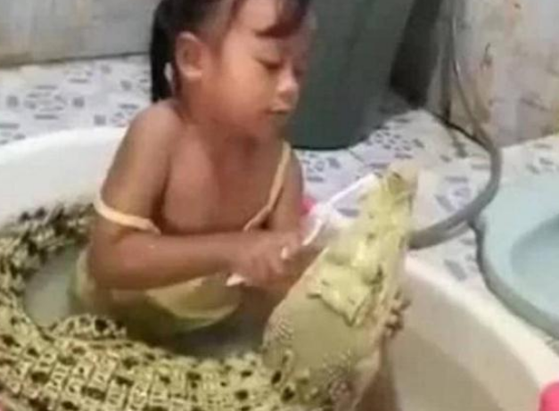 但是在印度尼西亚的爪哇岛的一个家庭的一个三岁的小女孩玛哈尼的宠物让大家下了一跳,因为她的宠物是一直鳄鱼,不仅如此小朋友还和这条鳄鱼一起洗澡,一起睡觉,真的是惊呆众人,画面中这小朋友就和鳄鱼在一起洗澡两人在一个盆子里泡着。