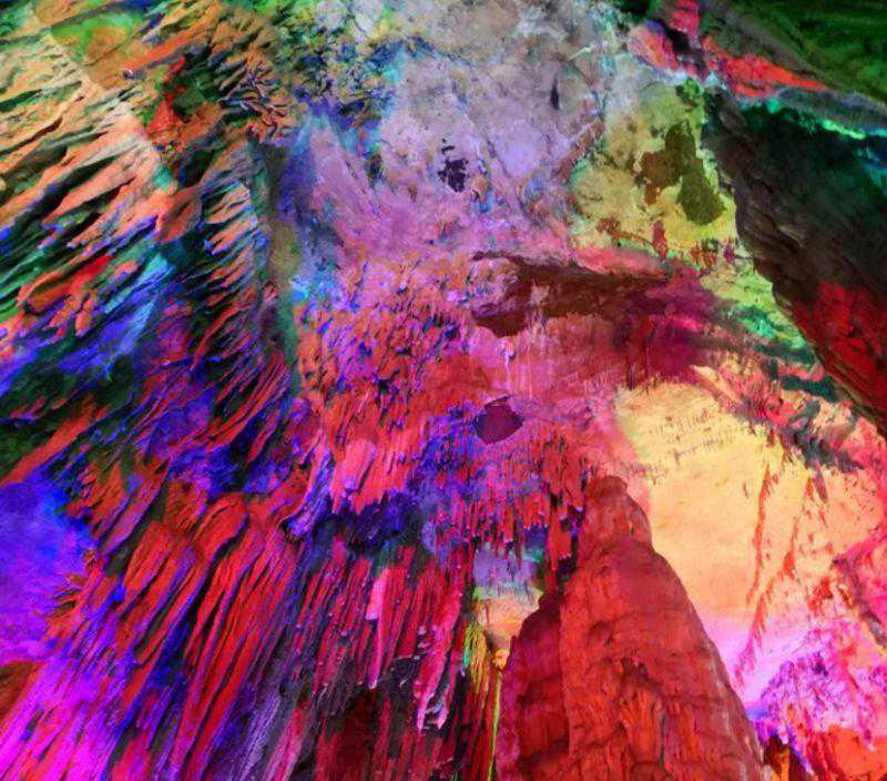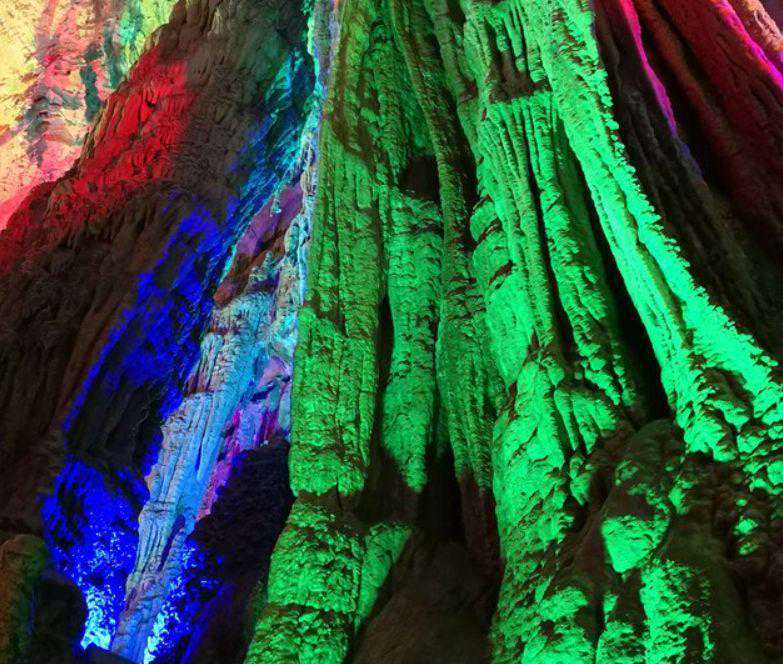 顺着水潭边的栈道,就进入了一个水溶洞,奇形怪状美丽神奇的钟乳石,在五彩的灯光映衬下仿佛被披上五色外衣。