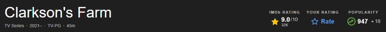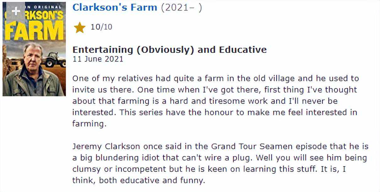 顾名思义,本片记录了这个叫克拉克森的人开农场的过程,这部片子的质量非常高,Imdb评分高达9分,豆瓣评分更是到了9.6分。