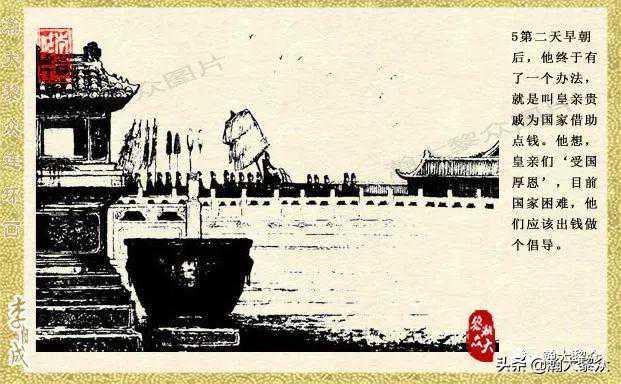 5第二天早朝后,他终于有了一个办法,就是叫皇亲贵戚为国家借助点钱。他想,皇亲们‘受国厚恩’,目前国家困难,他们应该出钱做个倡导。
