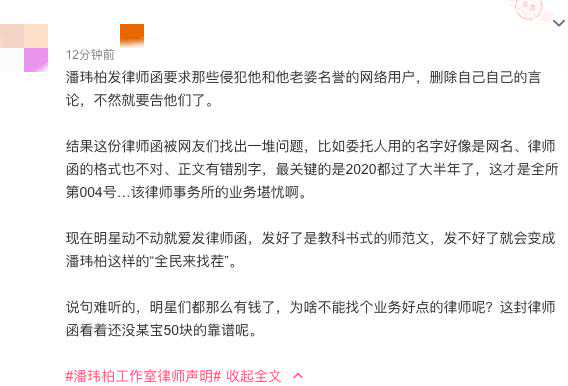 也难怪有博主感慨,"现在明星动不动就爱发律师函,发好了是教科书式的示范文,发不好了就会变成潘玮柏这样的'全民来找茬'"。