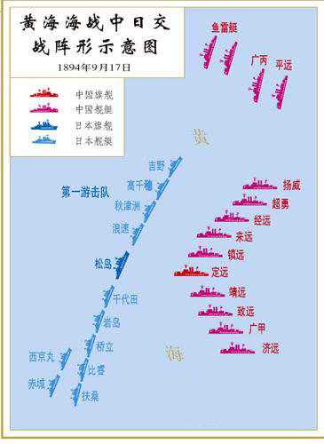 丁汝昌迅速命令10艘战舰列成五个小队,“定远”、“镇远”为第一小队;“致远”、“靖远”为第二小队;“来远”、“经远”为第三小队;“济远”、“广甲”为第四小队;“超勇”、“扬威”为第五小队。这样排阵是因为这些战舰在建造和定制时就是姊妹舰,除了“济远”和“广甲”外,其余小队的战舰速度和性能几乎完全相同,这样就有助于互相弥补,协同作战。