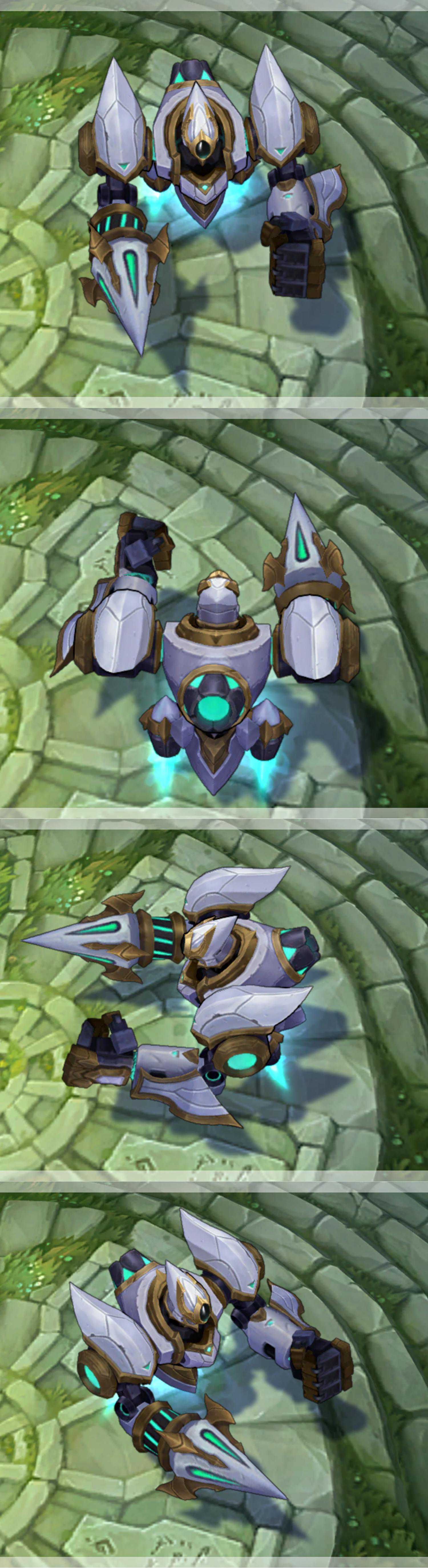 【R被动】:升级R技能后,身体就会被一层棕色电光护体保护。而且身上缝隙(水口)这时也会点亮为棕色。表现出能量过载的现象,这两种颜色的搭配比银白来得更显霸气和威严,肃杀感十足