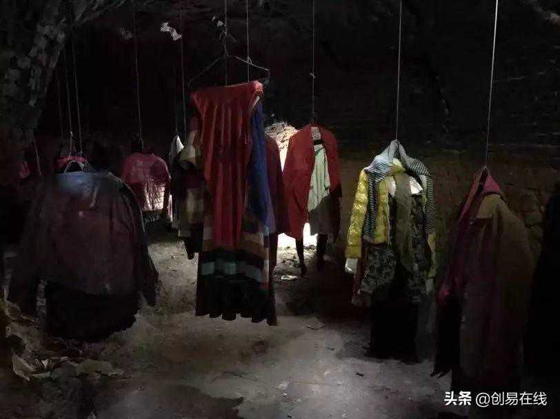 张素英的这个建筑,跟现代建筑那种钢筋水泥的结构完全不一样。它用的材料都是她从两公里外的垃圾坑里捡回来的建筑废料,比如破碎的瓦片、空心砖和旧门板等。建筑底层留了个五六十公分宽的小门进出,进门需要猫着腰才能进去。在底层挂着好多旧衣服,都是她觉得好看从别处捡回来的。她说她穿不了那么多,不穿的就一件件地挂起来,像服装展览似的。她说:”衣服堆着多了,容易发霉,这样就当是晾衣服了!“