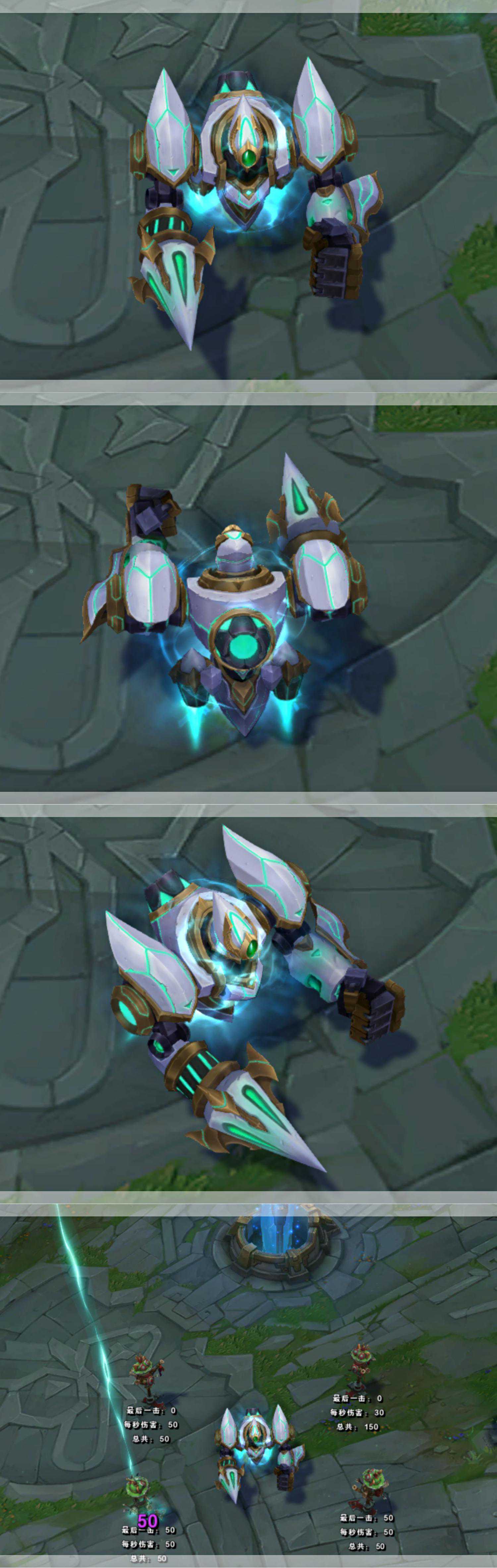 【R被动】:升级R技能后,身体就会被一层青绿色电光护体保护。而且身上的一些纹路或者说身上的缝隙(水口)更合适,这时也会点亮为青绿色。表现出能量过载的现象,这两种颜色的搭配非常简约且高级