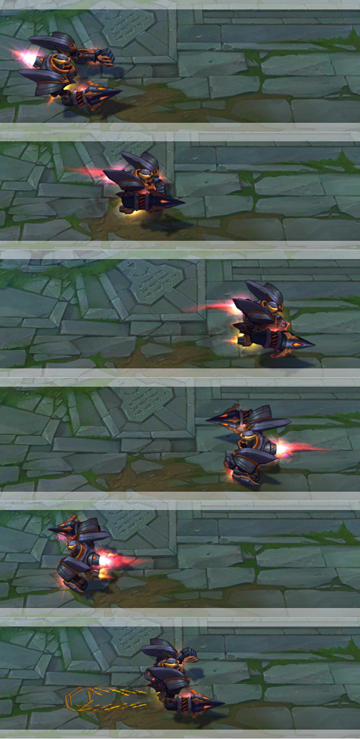 【W】:W技能开启,移动的途中,带钩子那只手会加速旋转,到最高转速时会出现电光。这款皮肤加速后的尾焰玫红色的,非常漂亮