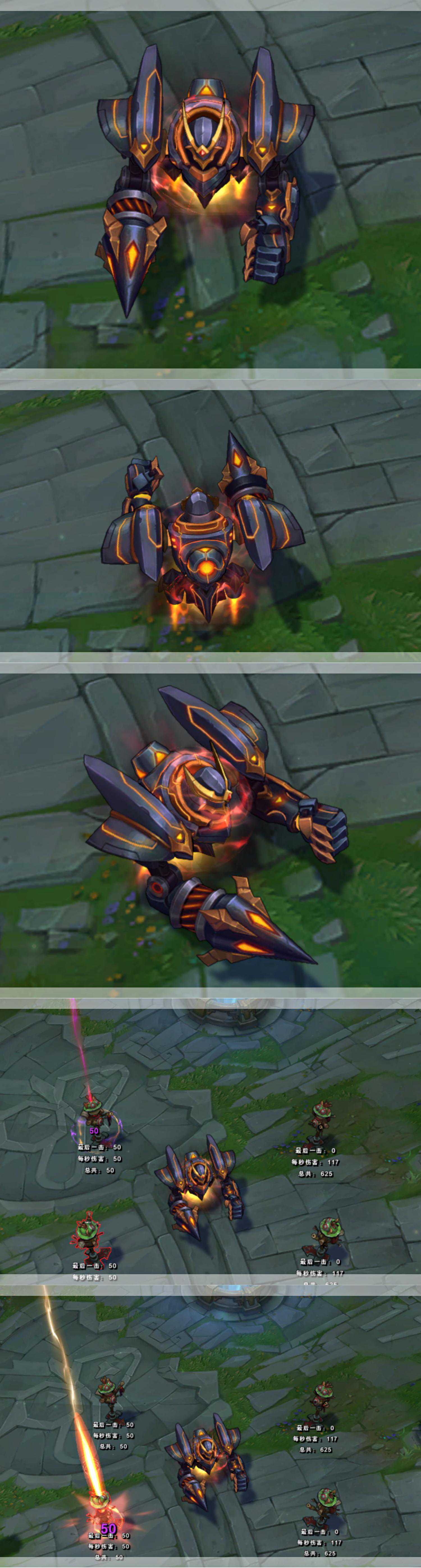 【R被动】:升级R技能后,身体就会被一层棕色电光护体保护。而且身上缝隙(水口)这时也会点亮为棕色。表现出能量过载的现象,这两种颜色的搭配比银白来得更显霸气和威严,肃杀感十足