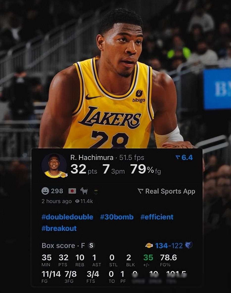 这位神秘杀手,正是湖人队的八村垒。在这场与篮网的较量中,他犹如一把锋利的剑,直插对手的心脏。全场14次出手,命中11球,其中三分球更是8投7中,狂砍32分10篮板,还有1助攻2盖帽的全面数据。真实命中率高达101.5%,如此惊人的效率,让人瞠目结舌。