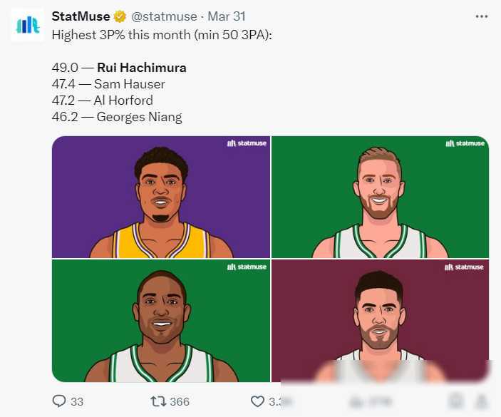 更令人震撼的是,八村垒在最近10场比赛中,三分命中率高达48.6%,仅次于詹姆斯的48.8%。他场均可以贡献17.1分,场均命中1.8记三分球,真实命中率高达72%。这样的表现,足以让他跻身联盟顶级锋线球员的行列。