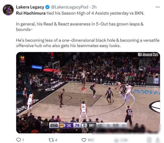 除了得分能力出众外,八村垒还在不断提升自己的串联意识。他在与篮网的比赛中送出了赛季新高的4次助攻,展现出了他在进攻端的多样性和全面性。他正在从一个纯粹的得分手,逐渐成长为一个多才多艺的锋线枢纽,为湖人队的进攻体系注入了新的活力。