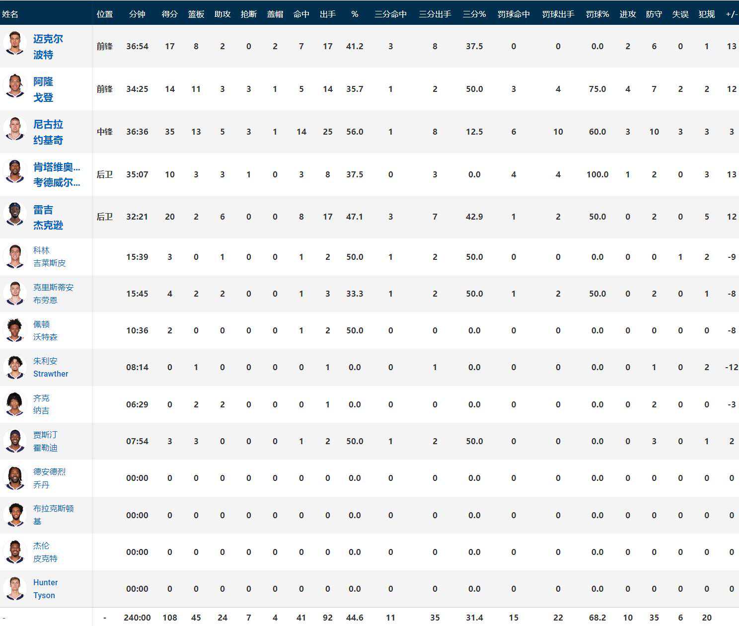 丹佛掘金约基奇35分13板5助3断1帽,雷吉-杰克逊20分2板6助,小波特17分8板2助2帽;