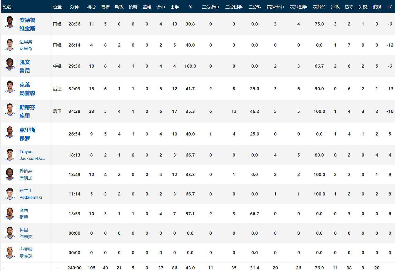 金州勇士库里23分5板4助1断,克莱-汤普森15分5板1助1断,维金斯11分5板。