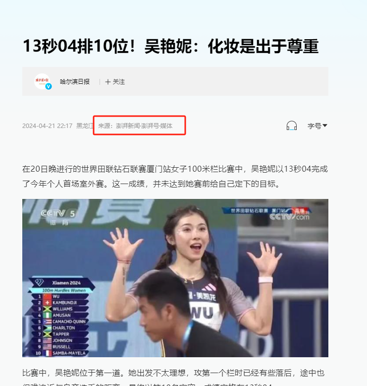 这是吴燕妮整体的穿搭和妆容,随后比赛就开始了。