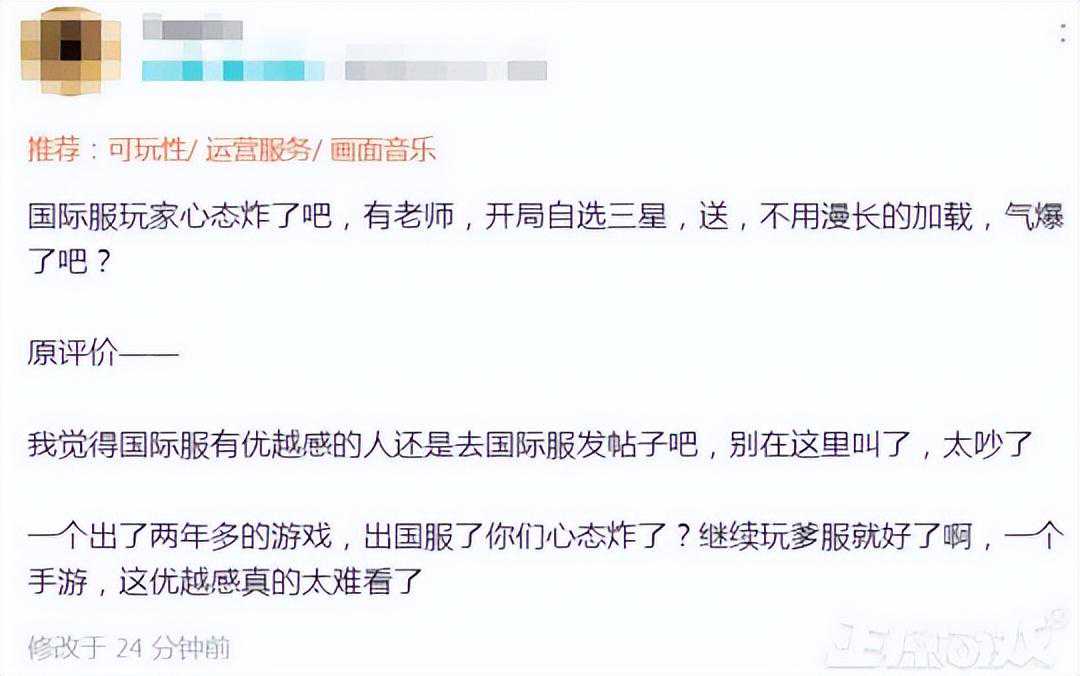 因为以上原因,很多国服玩家们都在晒自己的新手抽,不少新人轻松抽到了人气三星角色,还有一些欧皇抽出三个三星角色,这就引起了一些国际服老玩家的碎碎念了,于是有玩家就吐槽国际服玩家心态炸了,表示一些人的优越感太难看了。