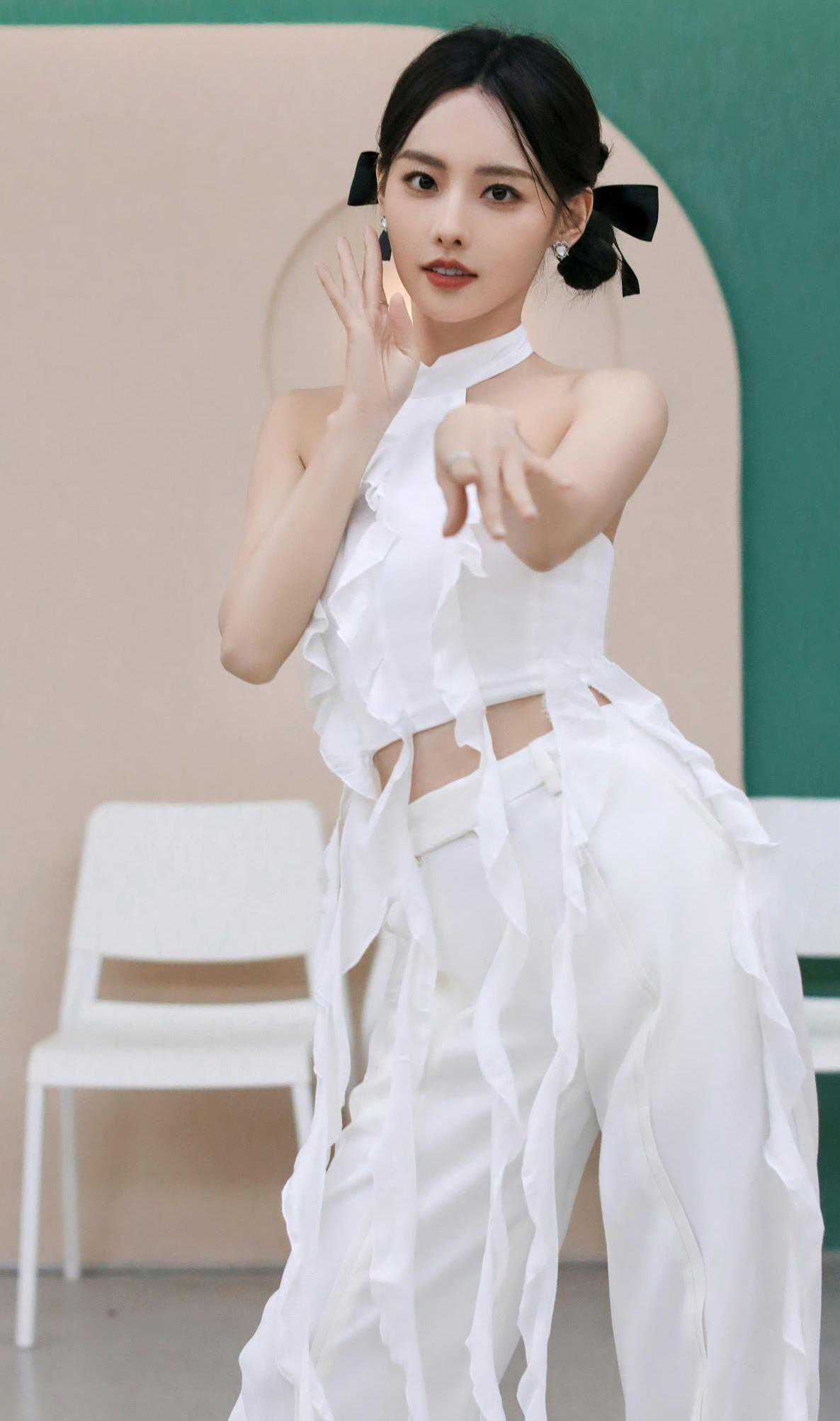 比如,她练舞时穿的这件白色挂脖肚兜+白色长裤,来自越南的小众设计师品牌。