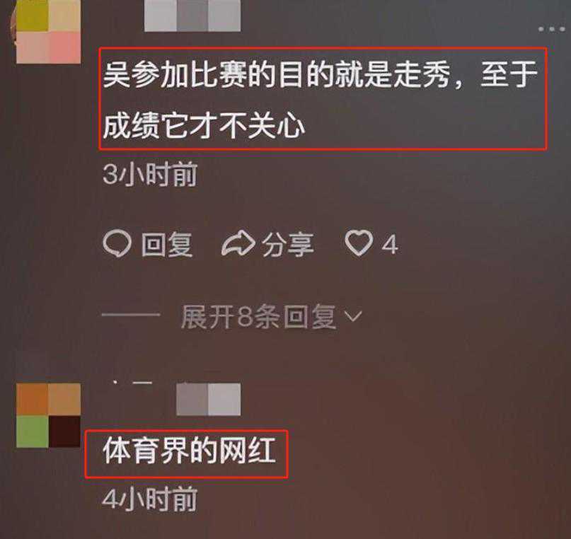网友争议吴燕妮这次再赛场上的打扮太过于耀眼,因此只要成绩出现一点差错就一定会有人把她的成绩和妆容放在一起比较。