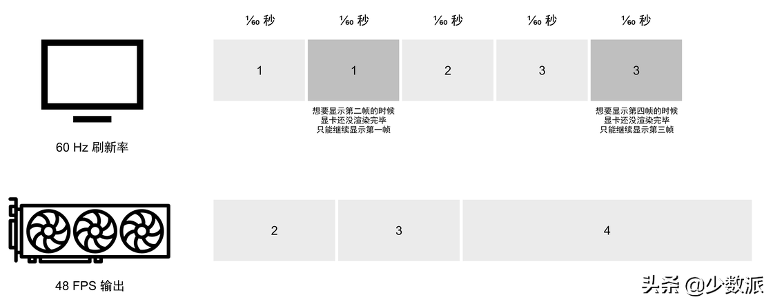 比如当遇到大面积的反射场景、光线复杂的环境或者物品爆炸等复杂的场景,显卡总是需要花费更多的时间才能渲染一帧,这时只能在一秒内只能输出48帧,那么你大概率就能察觉到画面已经发生了卡顿(注意不是撕裂)。这是因为显示器从前缓存读取画面并呈现出来以后,后缓冲区如果没渲染完的话,显示器会等待一个时间再去问前缓冲区索要画面。这时,你往往需要多等一段时间,显示器呈现的帧间隔就不均匀了,刚好人眼对不均匀的帧间隔很敏感,你就能很明显感知到画面发生了卡顿。