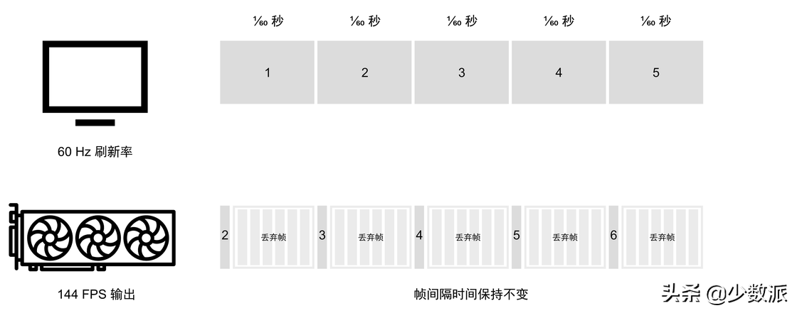 显卡输出帧高于显示器刷新率时,可变帧率会暂时不交换前后缓冲区,并用新生成的帧及时放入后缓冲区中覆盖旧帧,保证画面不发生撕裂地情况的同时,尽可能保证延迟和一般情况一致。