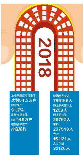 优秀的创业平台、优质的创业政策,创业之巢已筑好,创客们自然蜂拥而来。据西安市人民政府网站上公布的数据显示,2018年西安市全市新登记市场主体达到54.3万户,同比增长91.7%;累计市场主体超过148万户,在副省级城市排在前列。