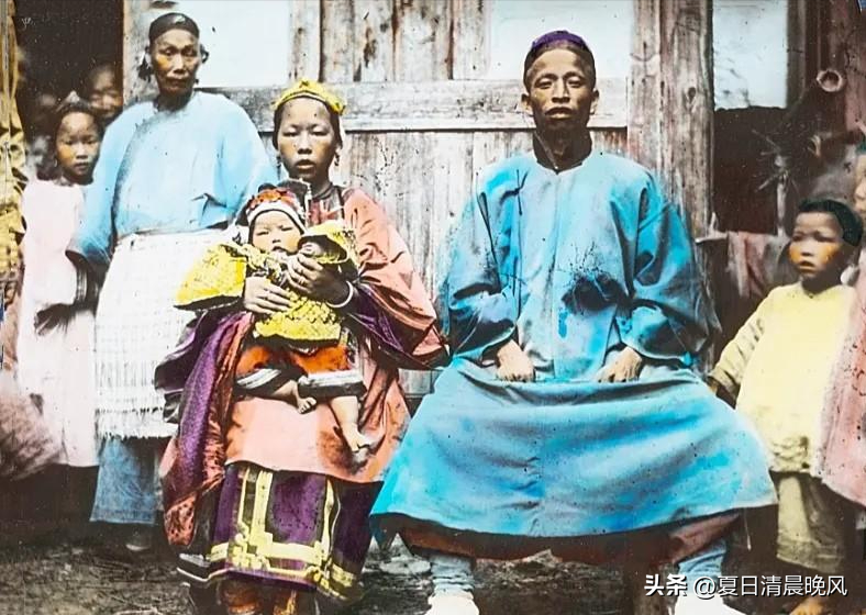 这张照片,反映的是清朝时期富裕家庭的生活场景。一名中年男子和自己的家眷在院子里合影。
