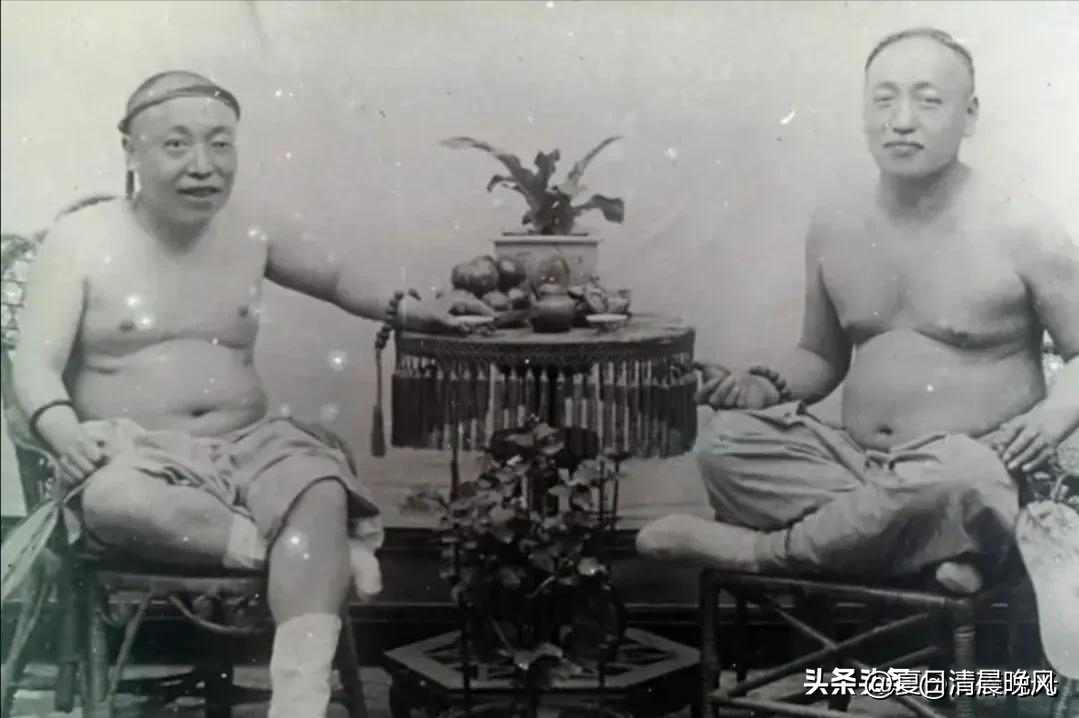 两位中年男子在消暑,上衣已经扒掉,辫子盘到头顶上。