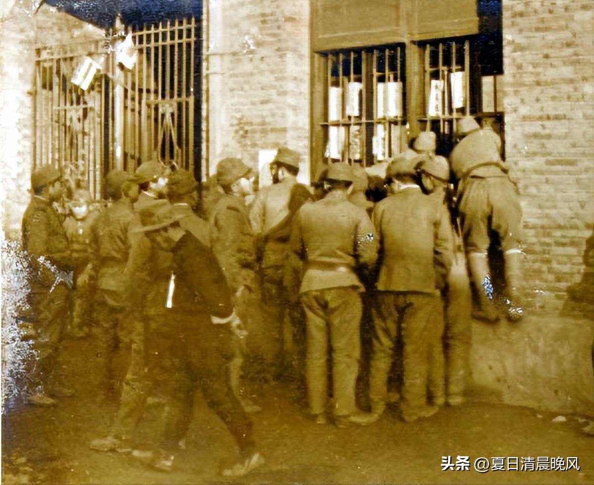 一群日本鬼子正趴在慰安所窗前观看,等待着发泄自己的兽欲。