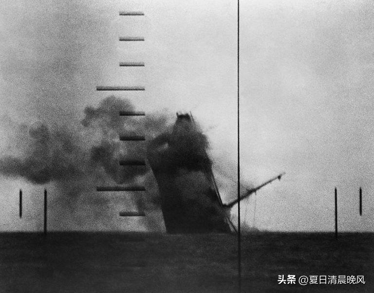 1942年太平洋,通过美海军“刺鲅”号潜艇(SS-238)的潜望镜拍摄的日本运输船"武洋丸"号被鱼雷击中并沉没的照片。