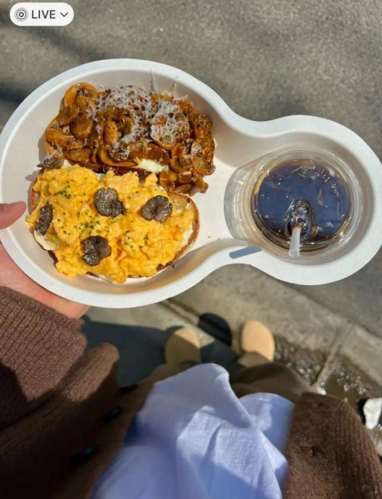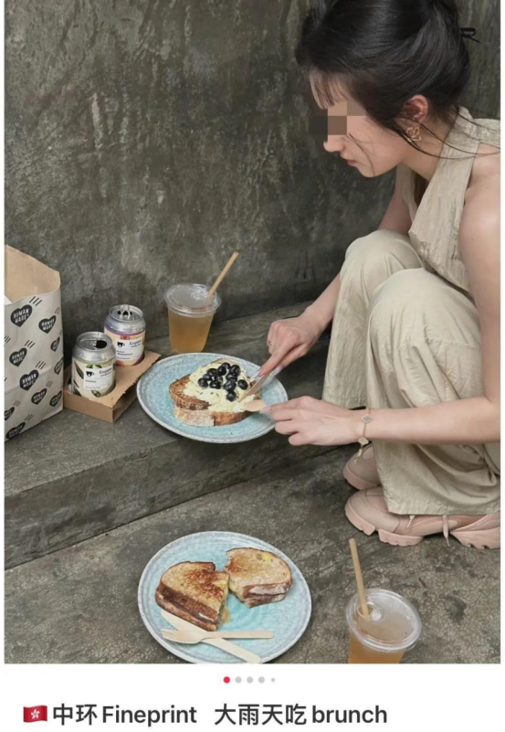 餐厅里面寥寥几人,餐厅马路对面齐刷刷的蹲了一排,更夸张的是有一位网红博主端着这一份“Brunch”辗转了3条街,拍摄了不同场景的“松弛感”照片,餐食却一口没动。