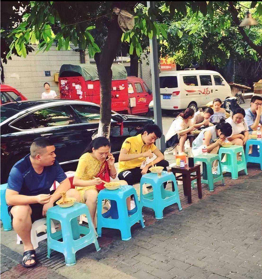 川渝伙伴们与生俱来的松弛感无人能敌,高板凳、低板凳分别往街边放一排,点一碗重庆小面就开吃。