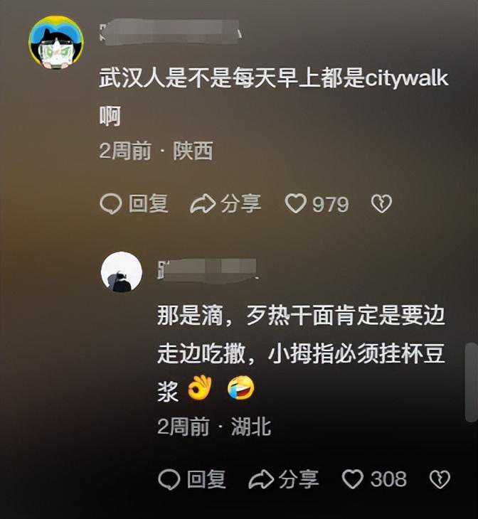 一位武汉网友回复:那是滴,热干面肯定是边走边吃边撒,小拇指必须挂杯豆浆。