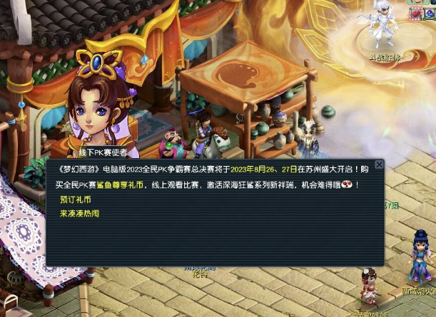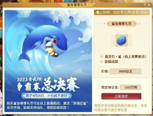 "全国总决赛期间将进行“鲨鱼尊享礼币”的限量售卖,购买“鲨鱼尊享礼币”可获得限量祥瑞“深海狂鲨”,而购买方式则是前往宝象国(28,23)线下PK赛使者处抢购。售价8888仙玉,购买获得祥瑞——深海狂鲨(1只),并获赠全民PK助威战鼓(1个)。"