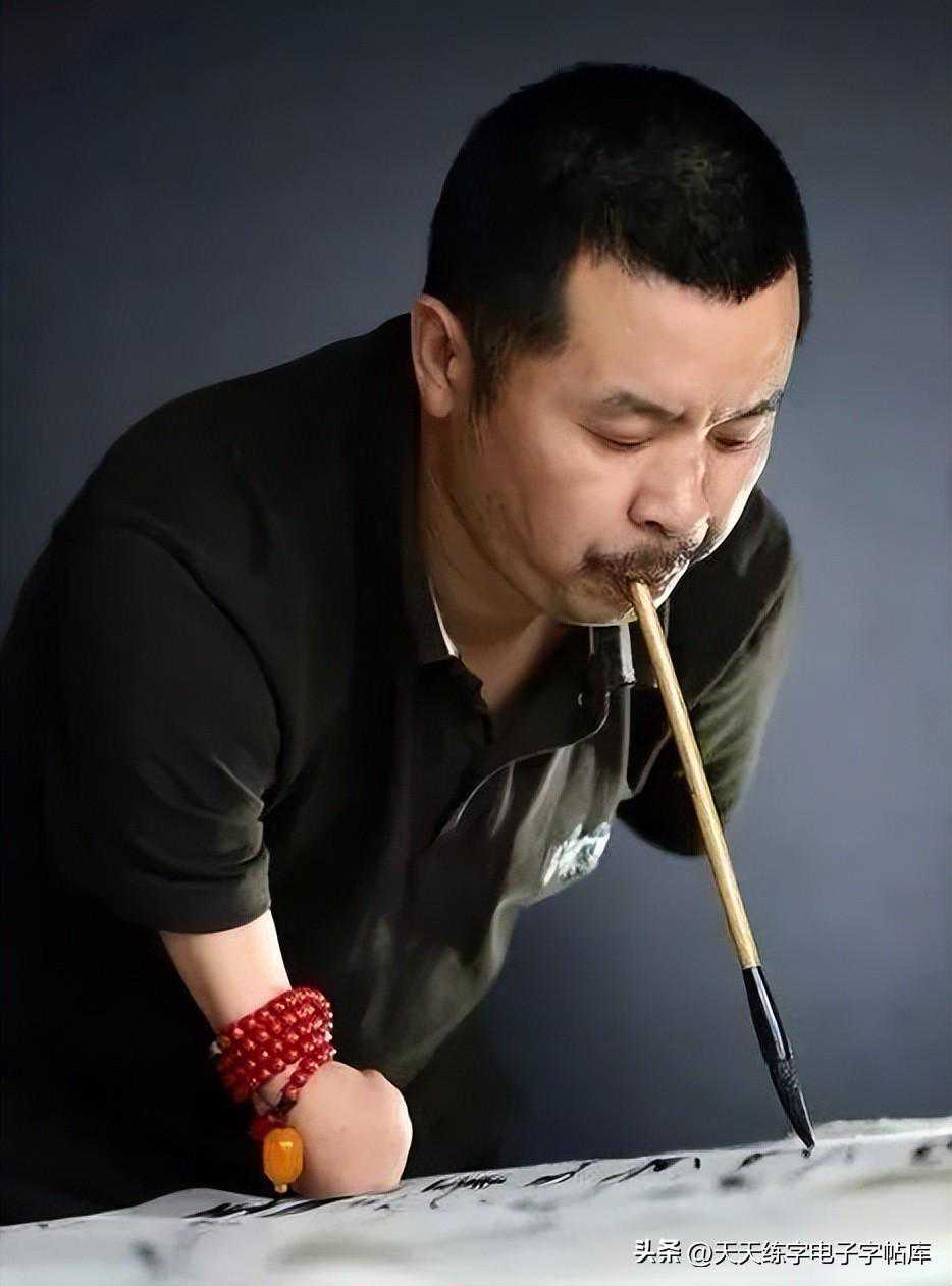 当一个用嘴巴咬着毛笔写字的人