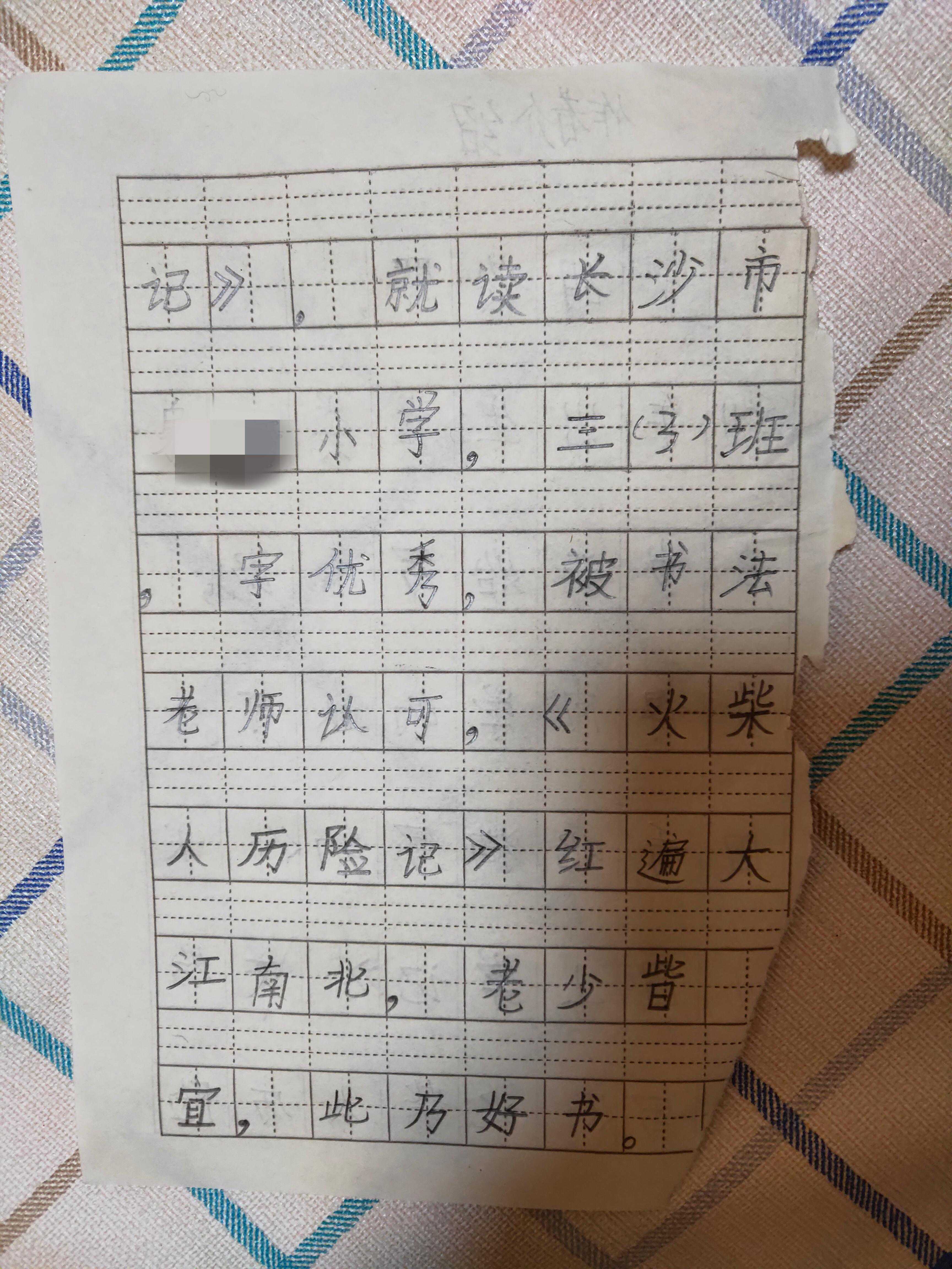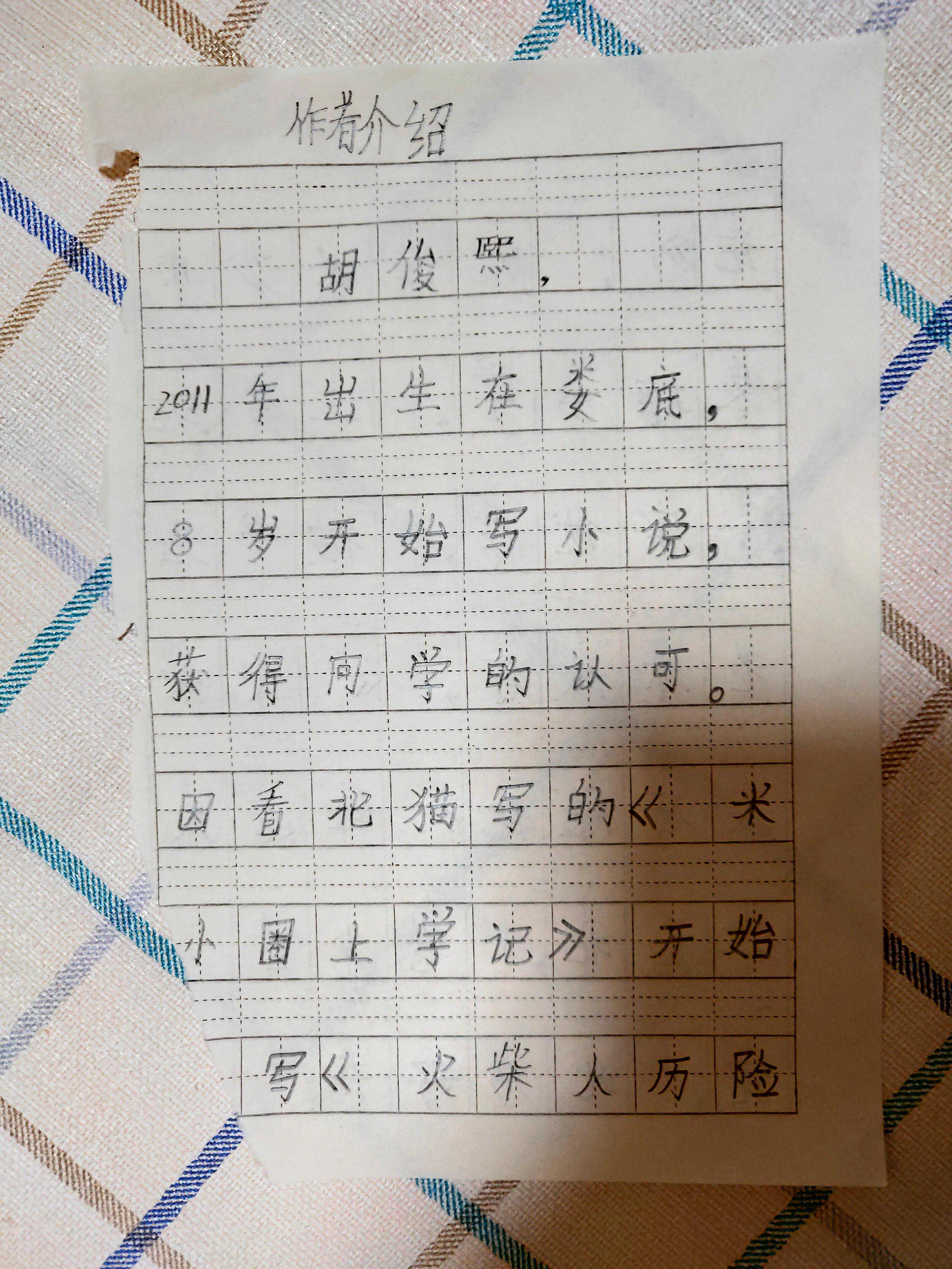这篇小说是儿子的处女作,前前后后写了半个多月。每天晚上,开着台灯,坐在书桌前,用铅笔码着格子。看着小小的身体、认真的模样,当妈的心情非常满足。