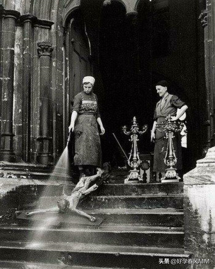 13德国纵火案后,两名正在给耶稣雕像清洗的德国妇女。