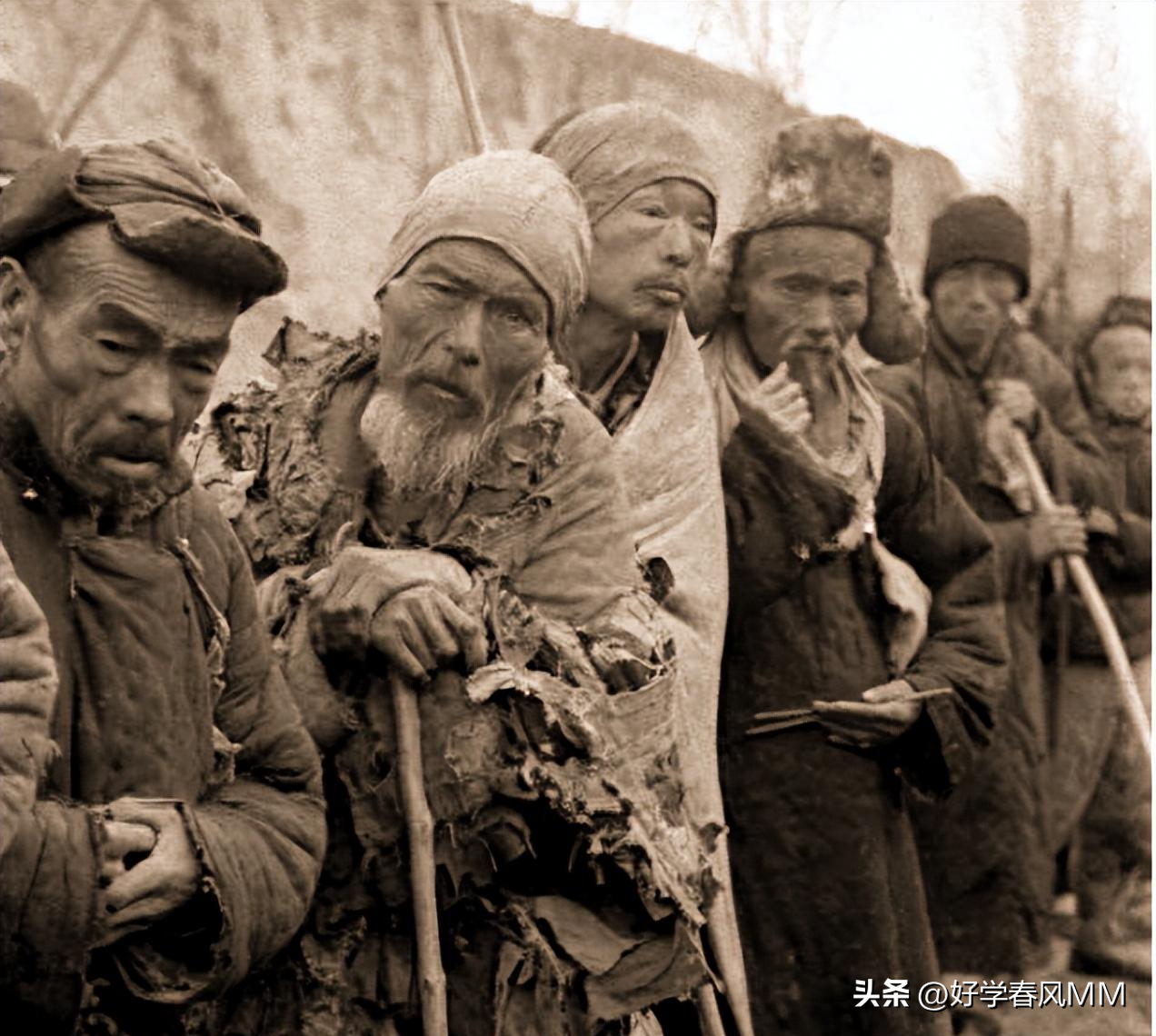22灾民们排着队等待救济的场景,可以看到他们的衣着十分破旧,表情也因饥饿而十分痛苦。