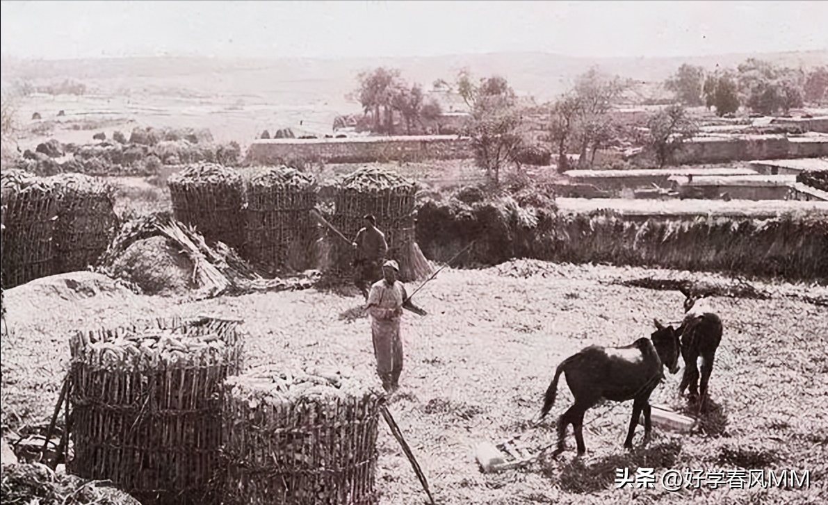 321970年代的生产队,两个生产队的农民在赶着毛驴拉着碌碡轧麦子。