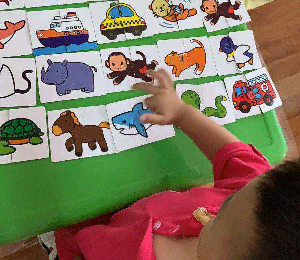 每一张拼图都是把整张图片分为两个图块,但是又带有一定的曲线,并不是简单的直线。这样的设计,既能够满足孩子对事物认知的好奇心,又能够让孩子进行观察,找到每个图块之间的差别和联系。从颜色、形状上进行区别和关联,让孩子爱不释手。