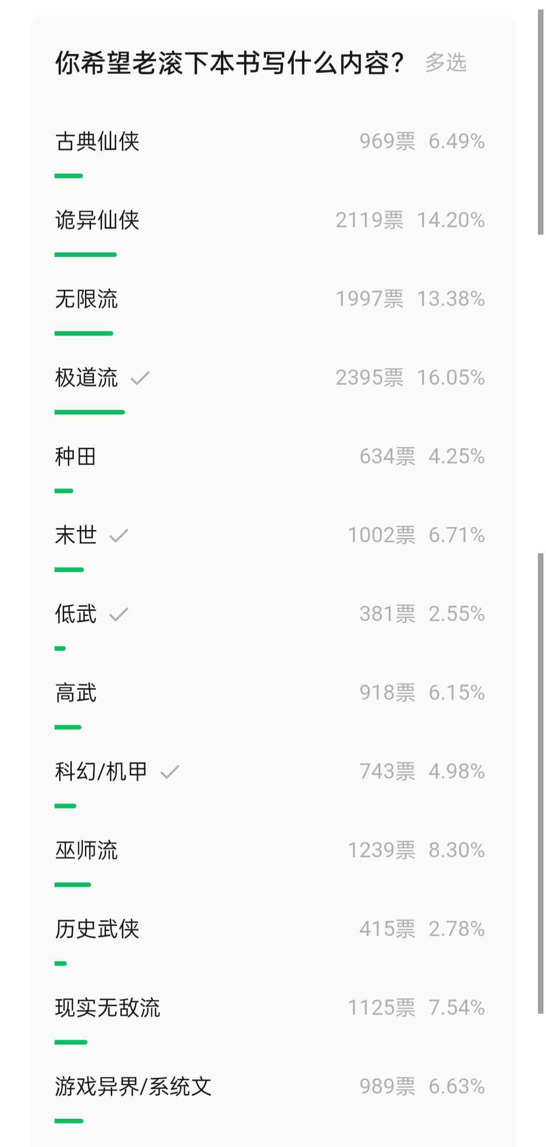 滚开在自己的公众号已经开了新书题材的选项,目前极道流、诡异仙侠、无限流三者领先,巫师、现实无敌、末世居于后面。看来大家还是十分认可滚开的极道文、诡异仙侠文的实力的。