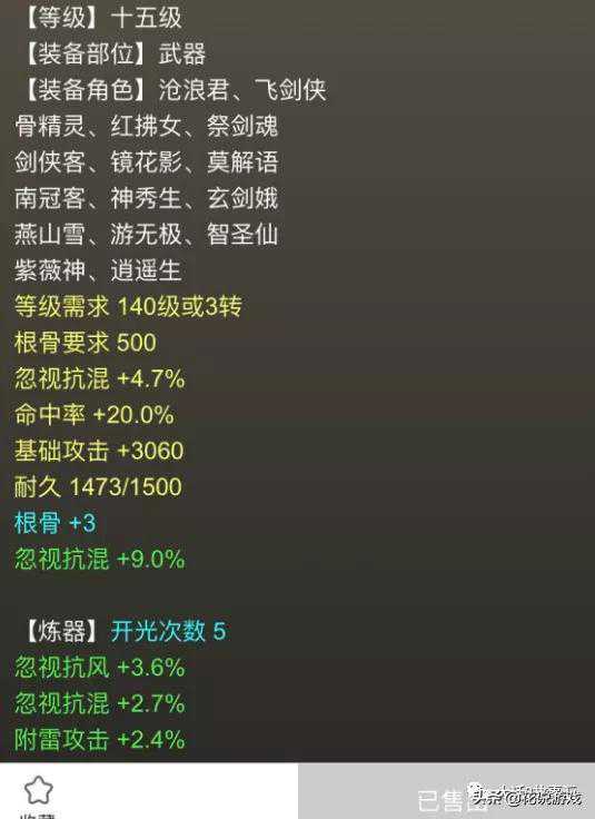 再给大家展示一把2200元成交的男人极品炼化。这是一把15级武器,炼化出忽视抗混9,炼器忽视抗混2.7,这两条属性已经是常人难以企及的极品了。可惜底子太拉胯,只有忽视抗混4.7。所以最终成交价只有2200元也说明了问题。确实和上一把男人武器无法抗衡。