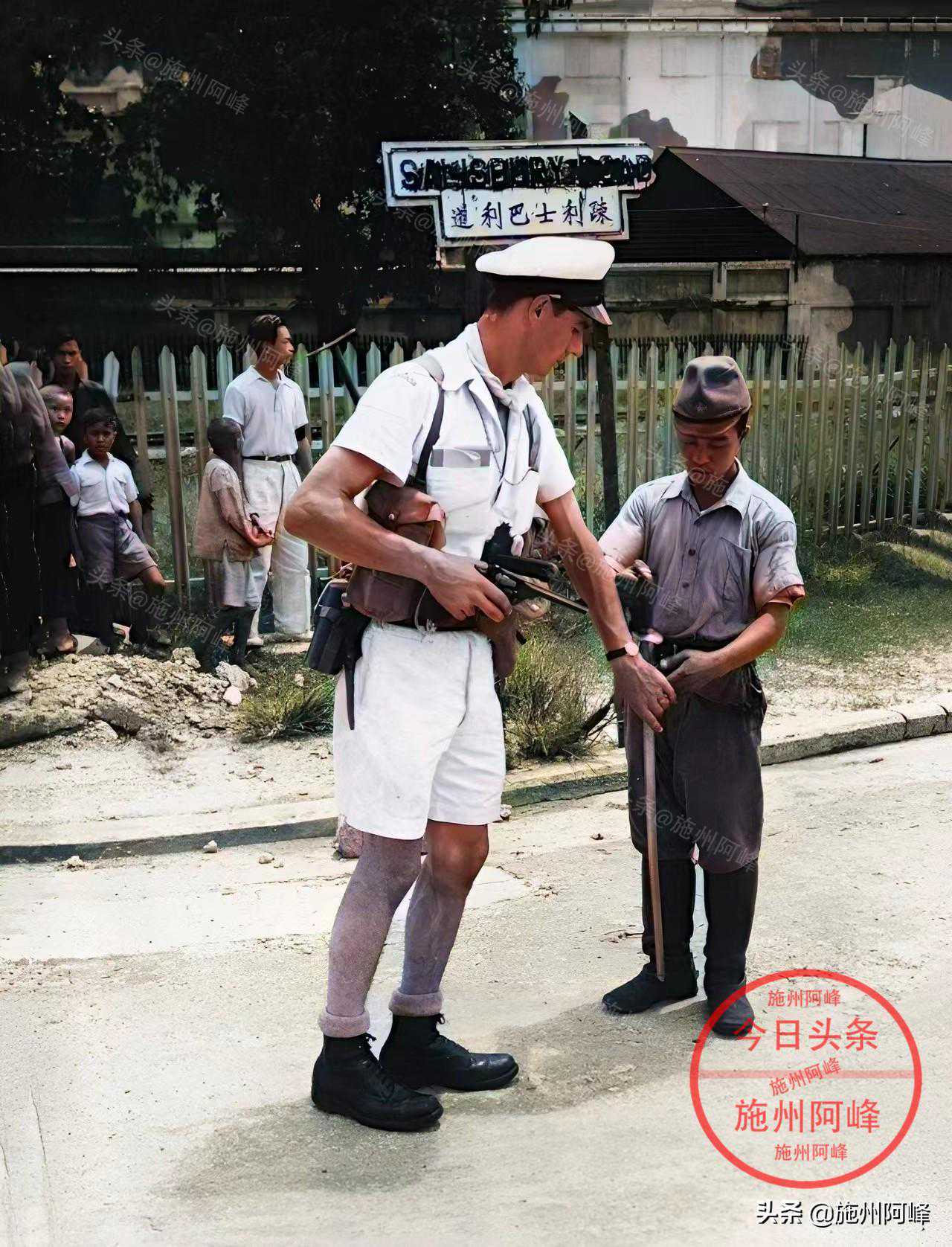 1945年9月在中国香港拍摄的照片,一名英国士兵正在收缴投降后的日军士兵的武器,对于英军在香港接受日军投降一事,可以说是英国人窃取了中国人民在香港进行抗日战争的胜利果实。