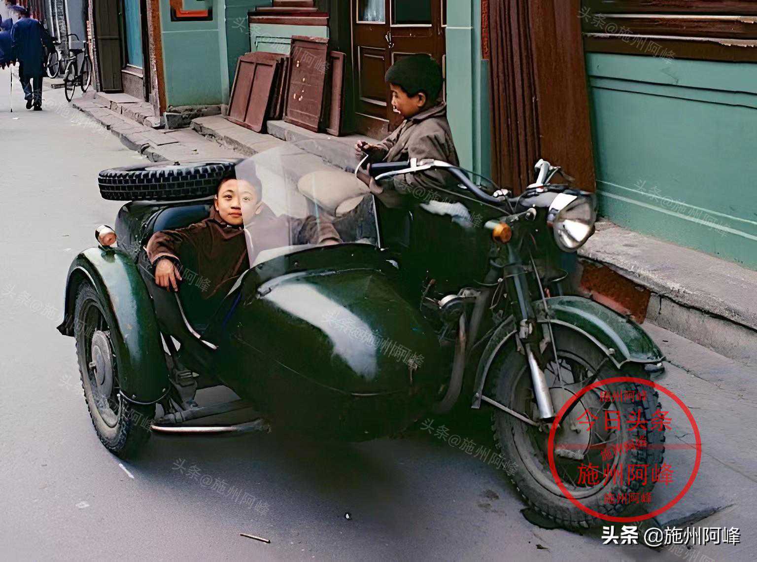 两个小孩坐在一辆三轮摩托车上玩耍,这种摩托车现在应该都是收藏品了。