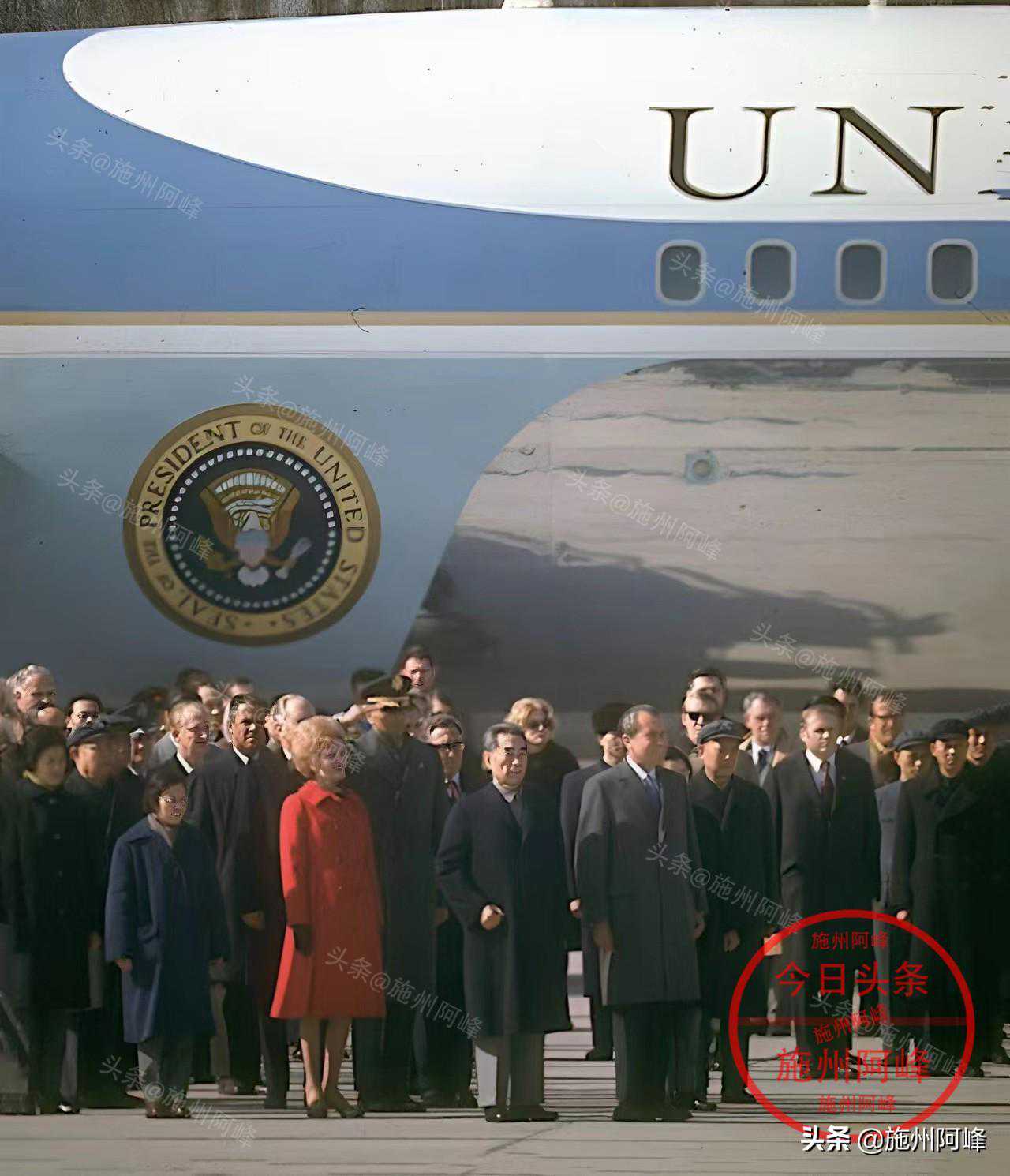 当时飞机降落机场后,尼克松和夫人看到前来迎接的周恩来一行人后,急忙走下舷梯向前来迎接的周恩来总理伸出了手,尼克松也是第一位访问中国大陆的美国总统。