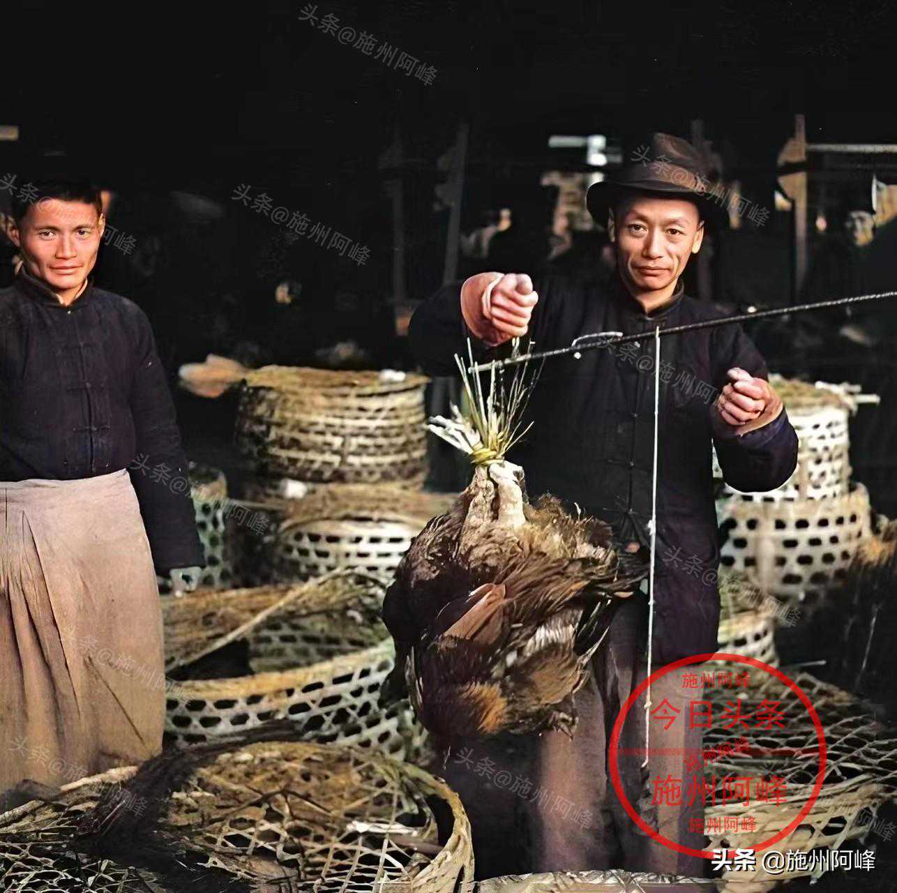 1946年拍摄的照片,一位售卖家禽的老板正在为客人称重一只老母鸡,当时农产品交易市场的人穿的衣服竟然看起来都有一股文化气息。