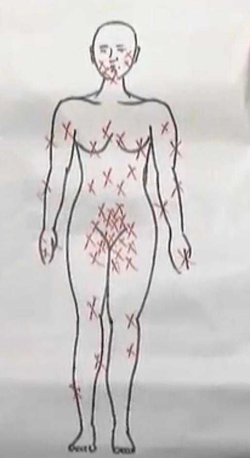 这是一张乔蒂全身遭到伤害的示意图,其中受伤最严重最多的地方就是私处,随后几个人把乔蒂的衣物全部抢走,然后将乔蒂和艾文德拉扔下了车,这时候乔蒂身受重伤,昏死了过去。