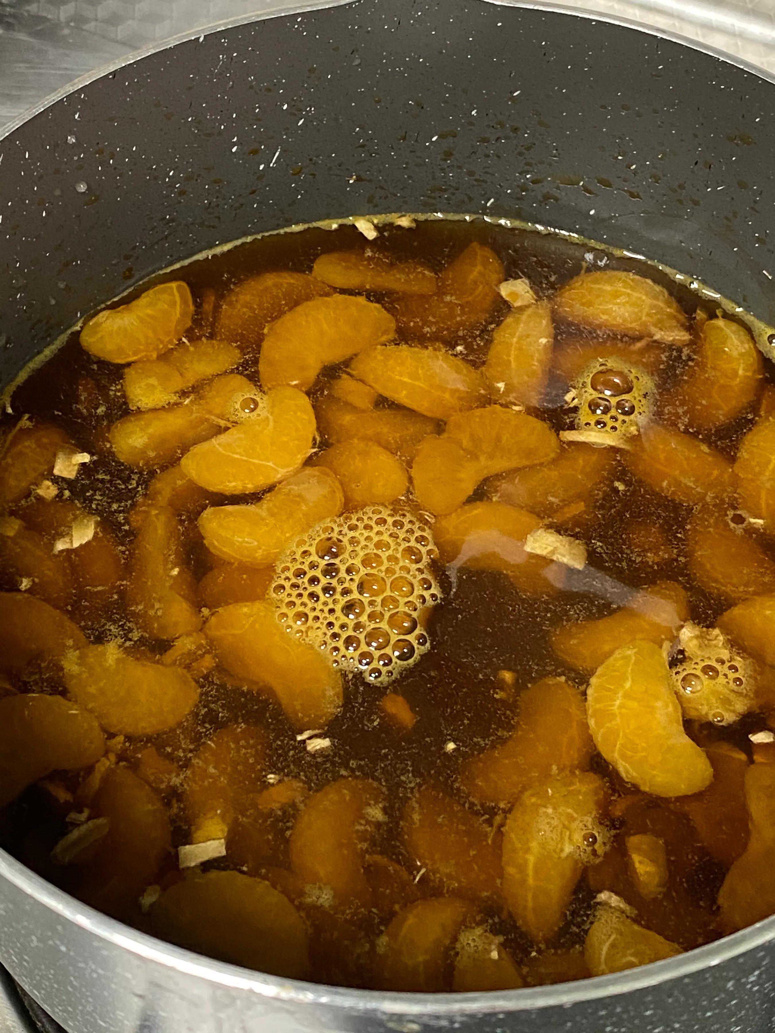 大火烧开之后,多煮个2分钟,让果肉膨胀一下,桔子果汁流进姜糖液!