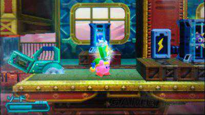 3.进入后会一直有风扇把你往前推,迅速吸收一个剑士能力,往前推的过程中砍断第一条锁链可以获得一条命,之后连续砍断两条锁链可以到下方门进去,进入后躲过铁柱子到上方砍断左边锁链可以让铁柱开启机关获得第二个IC,拿好就能出来了。出来后向上进门换场景。