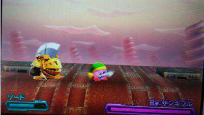 3.下去左边管道进去后会有个剑士敌人,干掉后下面两个箱子破坏能得到一张贴纸。然后继续往右走看见风扇,连按右(摇杆十字键均可)能够快跑通过。继续往右坐上双层五角星可以传送到里侧管道,向上一点能再次乘坐出来。往前连按十字键下可以从上面平台下来。之后会遇见小伙伴给你恢复的道具(用触碰或者Y均可使用),之后进入下个场景。