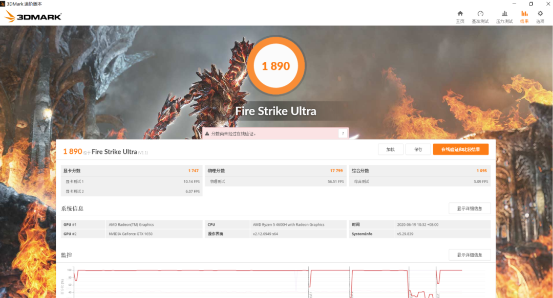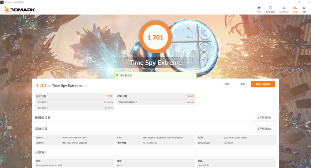 为了更清楚了解GTX1650表现,我们用3DMARK软件进行测试。
